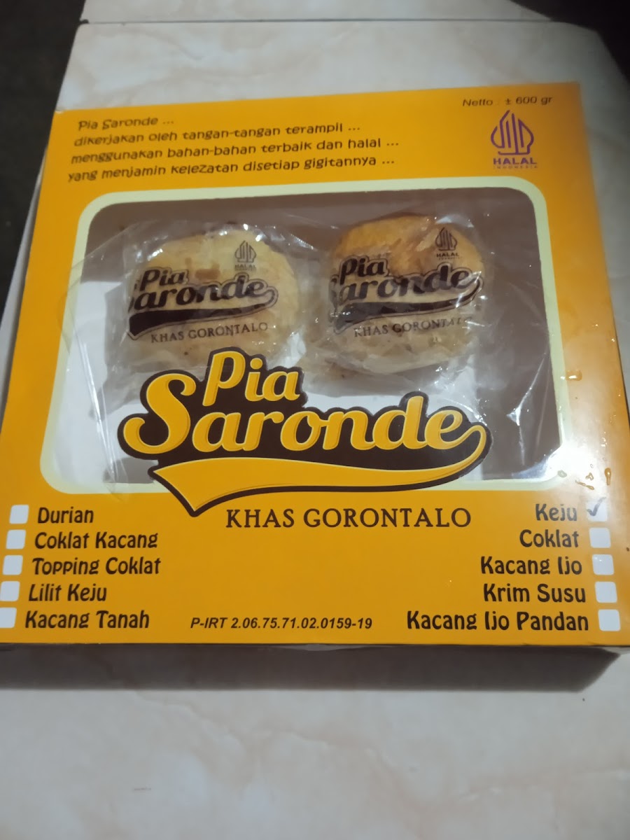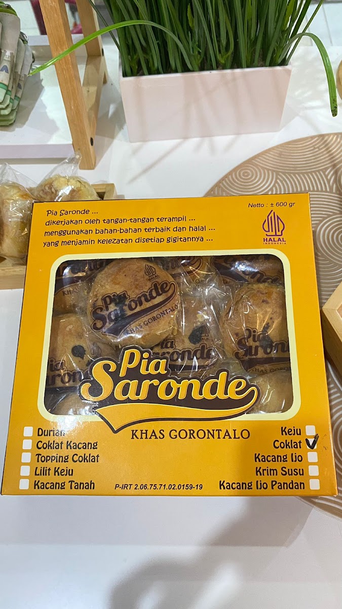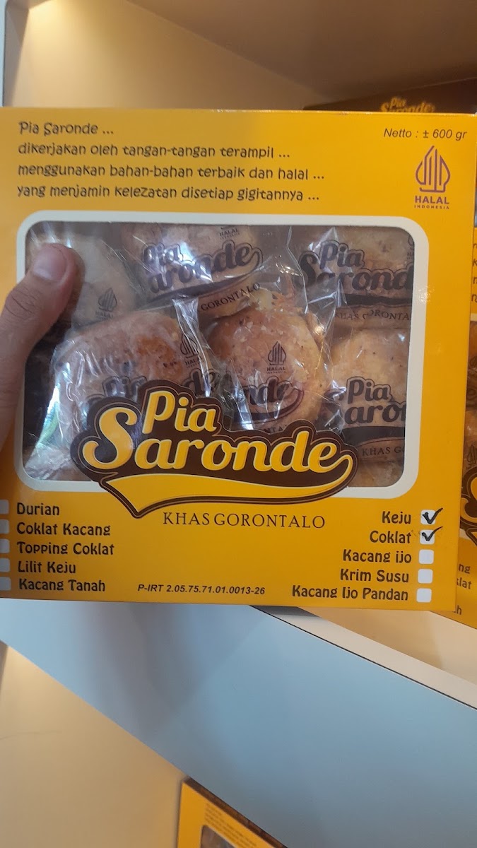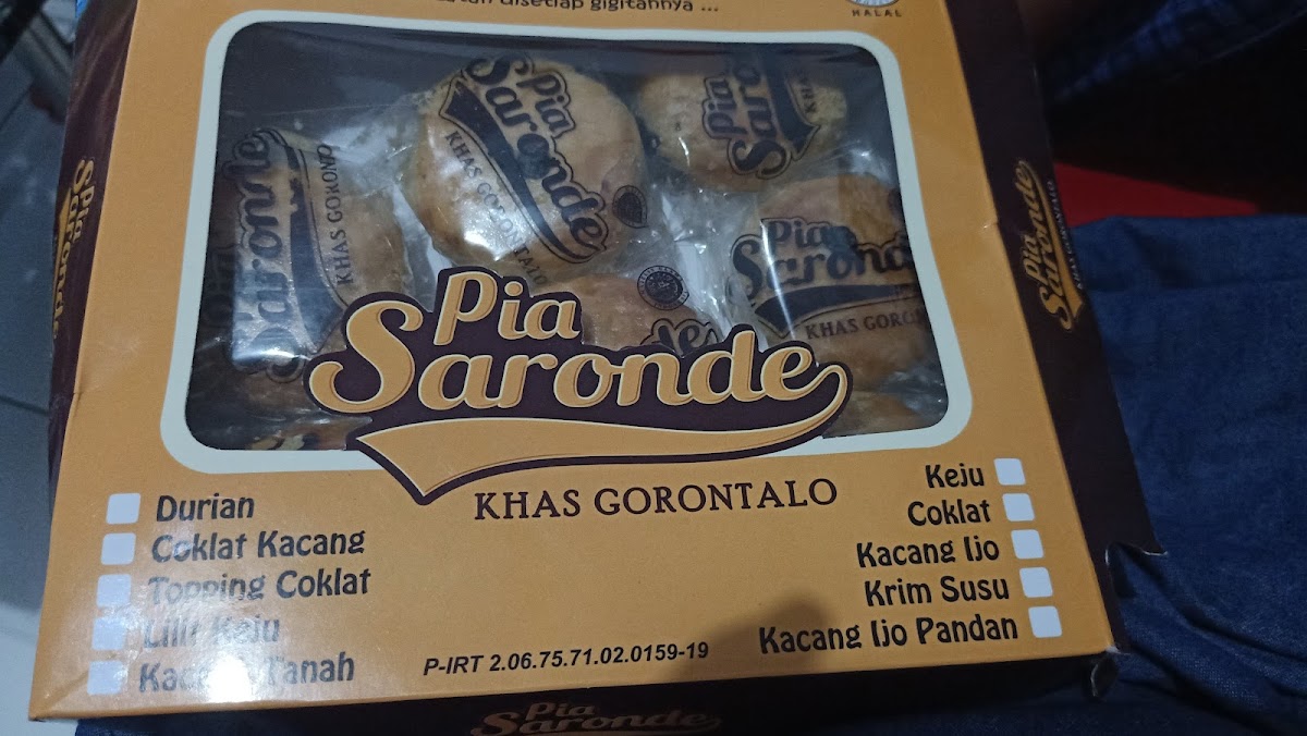 The menu at Pia Saronde primarily features a selection of traditional baked goods and local snacks, reflecting the culinary heritage of Gorontalo. The bakery specializes in various types of pia, a dough pastry known locally as "Gorontalo Piah," with popular varieties including fillings such as cheese, chocolate, and green bean pandan. Additionally, customers can find signature items like Kue Karawo and Pia Kacang Ijo Pandan.